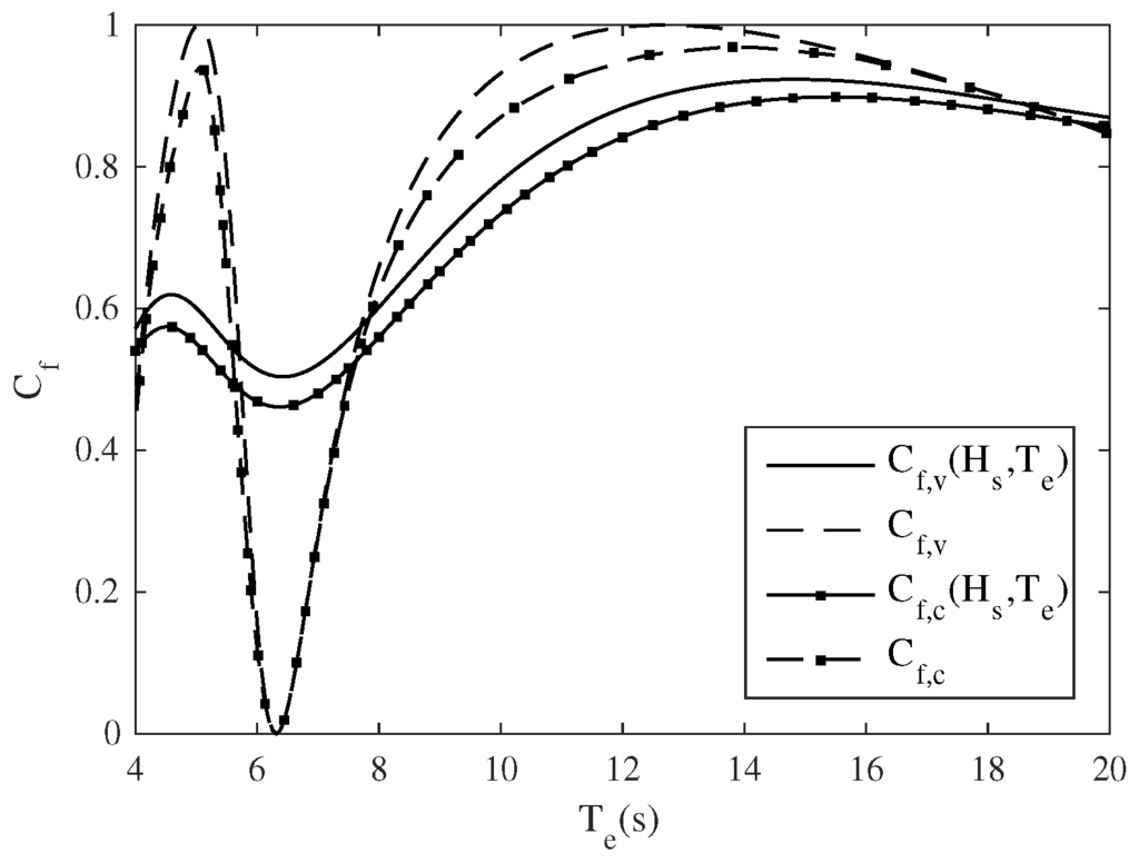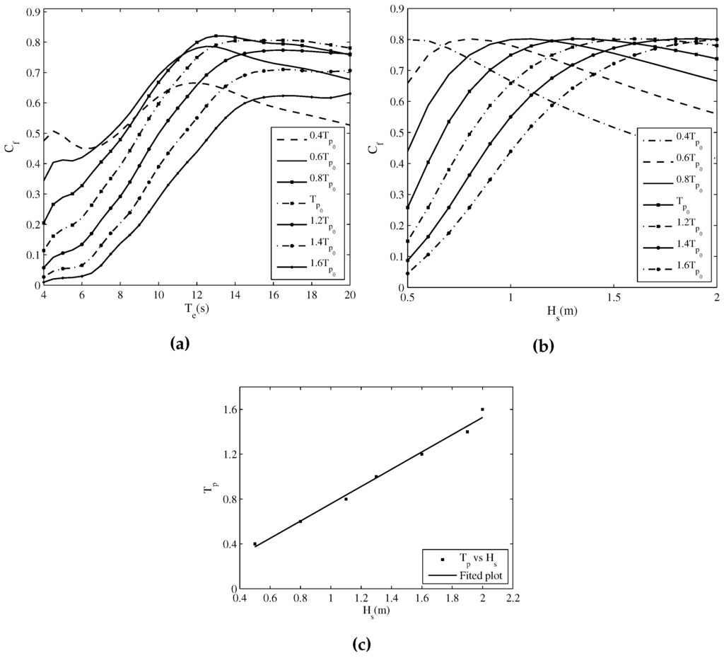 Variation of Cf with (a) Te; (b) Hs for different loading conditions; and (c) Optimum loading conditions for maximum Cf for different Hs.