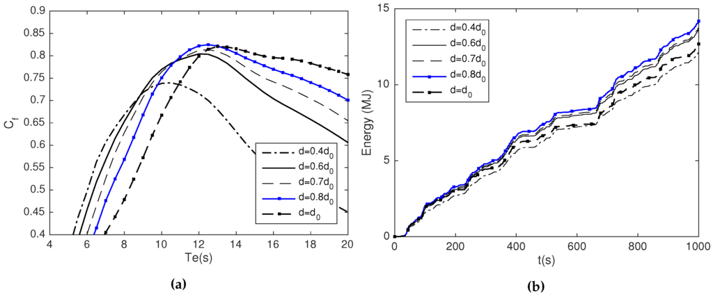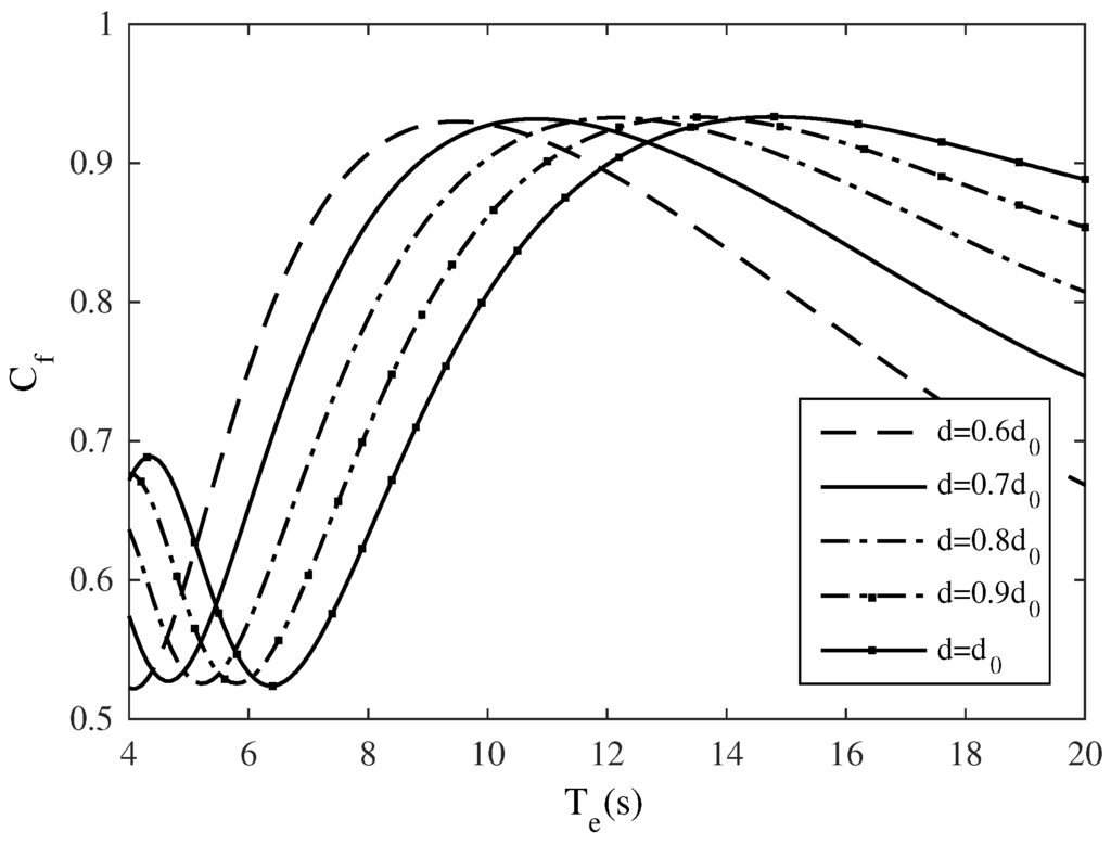 Figure 10a lists the variations with chamber length d. The peak capture factors are observed at different wave periods corresponding to the nodal points of the standing waves as explained above. Zero is seen at the corresponding anti-nodes. It is evident that the flap needs to be placed at a node at which the horizontal water particle velocity is predominant. At about the second peak region (relative to the wave period), where the device in this study is tuned, the bandwidth frequency is rather high. The curve gradient at lower wave period side also is higher than that of the higher wave period side. Therefore, in the design/tuning the device these features should be considered by setting the dominant frequency on the the higher side. Figure 10b indicates variations in the with the change in distance from the hinge point to the free water surface l (for same ). In this instance, small changes are noted in the peak period but without any critical effect to the system. Figure 10c shows the variations with the tide. A significant shift of about 1 s per 0.5 m change to the peak wave period of the tide can be seen.