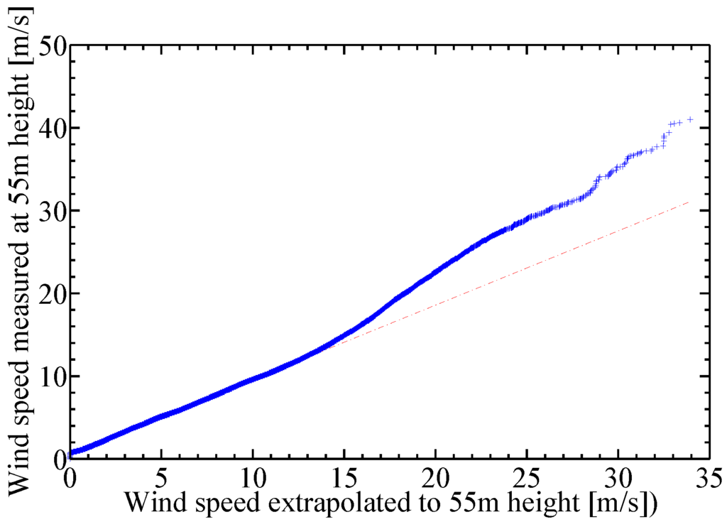 Quantile-Quantile Plot (QQ-plot) of measured data at 55 m vs. data measured at 10 m extrapolated to a 55 m height.