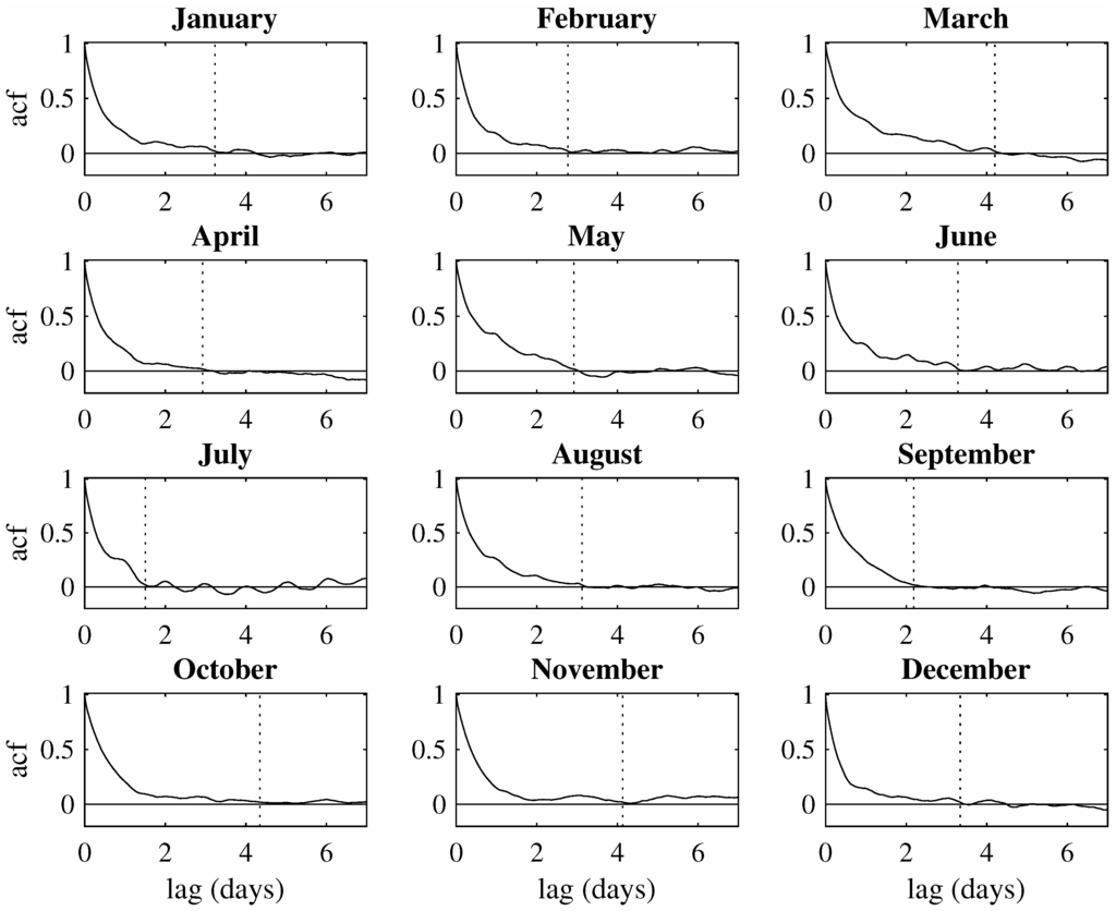 - Plot the sample autocorrelation for individual months for visual inspection. The smallest lag, such that the sample autocorrelation goes below 0.02, is defined as the lag where the autocorrelation becomes none influential.