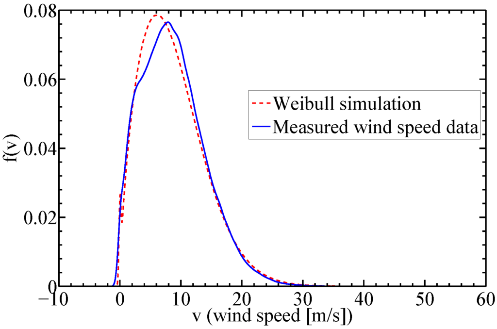 where is the gamma function. Various methods have been used to determine the shape and scale parameters of the Weibull distribution function. Analytical and empirical methods used to find the Weibull parameters are often referred to as classical methods. Other methods match the average wind power density and the occurrences above average wind speed to the Weibull distribution [18]. Discrepancies can appear between measured and statistical distributions. However, because of measurement errors or lack of data, the statistical distribution may be considered as more representative for the long term compared to a sample of measured data [18]. In this research, the built-in MATLAB function wblfit was used to compute maximum likelihood estimates of the Weibull shape and scale parameters. Here, a slight modification to a Weibull simulation, based on a single density, was made. It is unreasonable to fit one Weibull distribution to all data from a single site, due to the fact that wind distribution is different between yearly seasons [19]. The modification lies in dividing the wind speed data into wind directional sectors, as wind direction tends to depend on yearly seasons. A Weibull distribution was fitted to data within each of the eight selected wind speed sectors, which are divided by the north-south line, the northeast-southwest line, the east-west line and the northwest-southeast line. Dividing the data into directional sectors should give a better Weibull distribution fit, since dominant wind direction tends to change according to seasons, and the wind speed varies with season. This method of dividing the wind data into directional sectors was presented by Torres et al. [20]. It characterizes wind speed data according to wind direction. The simulation of wind speed samples based on the eight fitted Weibull distributions is conducted by randomly selecting the sector according to the estimated probability of being within each sector, then a wind speed value is simulated from the fitted Weibull distribution of the selected sector.