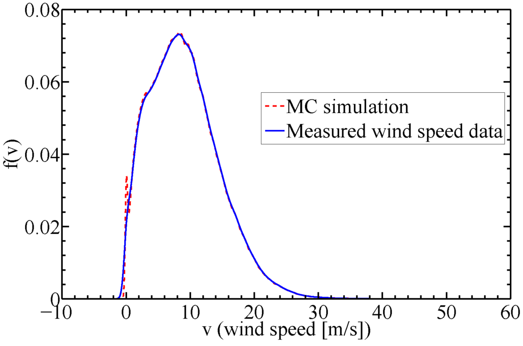 The results of MC wind speed simulation and its comparison to the observed data at Burfell are presented in Figure 5 and Table 1. From Figure 5, it can be seen that the marginal pdf of the simulated samples gives a good match to the pdf of the observed data, which is not surprising, as the simulated samples are solely based on the observed data. The summary statistics from Table 1 verify that the MC wind speed simulation gives a good match to the observed data.