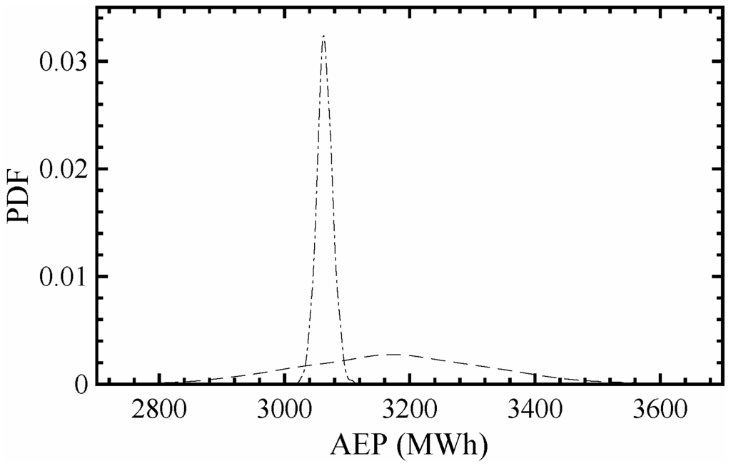 When used in the AEP calculation, methods like Weibull tend to give a narrow band result and even underestimate the AEP. Researchers have tried to address this by, e.g., looking at the error function and use an artificial neural network (ANN) with weights [9] and with a Bayesian approach where long-term wind data from a weather station is combined with short-term wind data from the site to consider uncertainties [10]. To deal with uncertainty, Kwon [11] introduced a Monte Carlo simulation to generate a better AEP estimate. This approach was based on a Weibull generated wind density dataset.