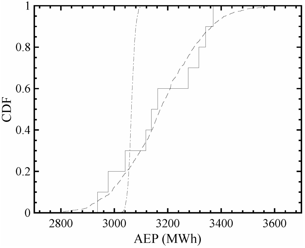 By using 10 years of wind speed data (2004 to 2013) from Burfell and transforming them to AEP data using the power curve of the E44 900 kW wind turbine, estimates of the AEP corresponding to the actual observed wind speed at Burfell for the years 2004 to 2013 are obtained. These ten estimates of actual AEP are compared to the simulated AEP based on the MC wind speed simulation and the Weibull wind speed simulation. Note that these two simulation methods use the same power curve and the same wind speed data. The cdf of the ten estimates of actual AEP is shown in Figure 7 along with the cdfs of AEP based on the two simulation methods. It is clear that the distribution of AEP based the MC wind speed simulation is much closer to the estimated AEP for the last ten years than the distribution of AEP based the Weibull wind speed simulation. What can be learned from Figure 7 is that P90 is overestimated, and P50 and the scale of the AEP are underestimated using the Weibull wind speed simulation, while the MC wind speed simulation is in close agreement with P90, P50 and the scale of the AEP.
