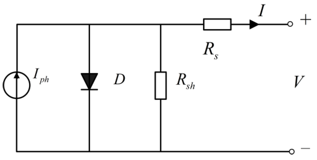 where I is the output current of the PV module in A, and V is the output voltage in V. Iph is the light-generated current in A, Is is the diode reverse saturation current in A, q is the electron charge, q = 1.602 × 10−19 C, k is the Boltzmann’s constant, k = 1.381 × 10−23 J/K, A stands for the ideality factor of P-N junction, , T is the cell temperature in °C, Rs is the intrinsic series resistance in Ω, Rsh is the shunt resistance in Ω, Isref is the cell reverse saturation current at Tref, Eg is band gap of silicon, Eg = 1.12 eV (at 25 °C), Iscref is the short circuit current at 25 °C and 1000 W/m2, KI is short circuit current temperature coefficient in A/C, and λ is solar irradiation in W/m2.