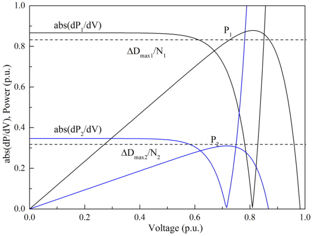 As shown in Figure 5, curve P1 and P2 are the output power of a PV array under different irradiation levels. The scaling factor N1 and upper limiter step size ΔDmax1 are chosen by reference to P1; in this case, fast dynamic response and good steady performance are achieved simultaneously. However, when irradiation changes greatly, the same parameters always make the system operate within the variable step size mode for P2 curve, which increases the start-up time, as well as the response time. If the scaling factor N2 and upper limiter of step size ΔDmax2 are selected according to power curve P2, the variable step size area of the system that worked for P1 curve becomes too small, which incurs severe oscillations at steady state and continuous power loss. All in all, the parameters have a significant effect on the system performance, and a poor choice may lead to inefficiency or failure during start-up or dynamic tracking. It is then impossible to find suitable scaling factor and upper limiter of step size that satisfy the requirements of the MPPT system under enormous irradiance changes. Furthermore, manual tuning of these parameters for different kinds of PV arrays restricts its application.