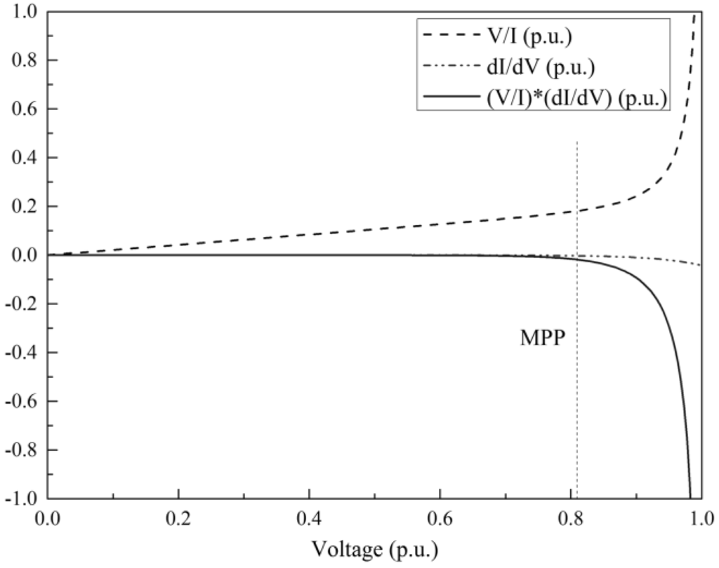 where V/I represents instantaneous resistance and dI/dV represents incremental conductance. Figure 6 shows that, as output voltage V increases, V/I increases from zero, while dI/dV is almost zero when the operation voltage is located in the left side of MPP, where the current change is almost zero, and dI/dV decreases along with V increases. Therefore, (V/I) × (dI/dV) decreases negatively, and its practical value is −1 at the MPP (curves shown in Figure 6 is normalized value), which can be also validated as follows: