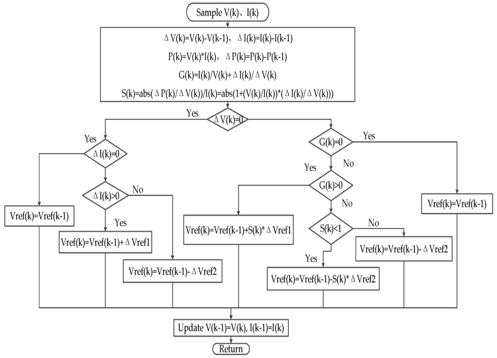 This method judges firstly whether the work point is located on the left side or the right side of the MPP and then selects the corresponding formula to calculate. It is based on dI/dV and V/I, which can reduce the computation burden effectively. However, this scheme does not take into consideration that the initial step size has an effect on the performance of the system.