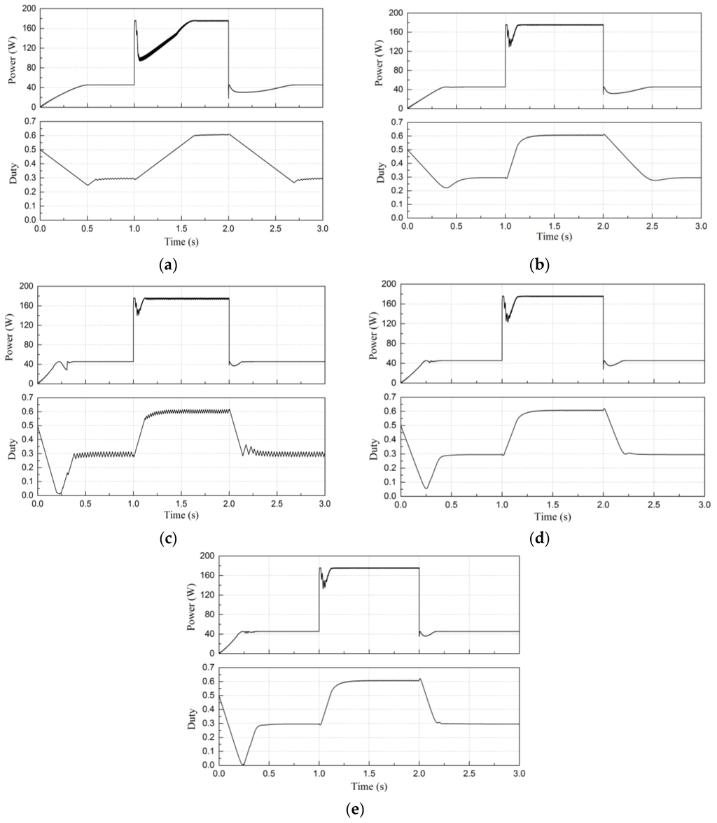 As illustrated in Figure 4, a simulation model of PV system is developed in Matlab/Simulink to verify the effectiveness of the proposed algorithm. To compare the performance of the MPPT methods, a series of simulations are conducted under the same step-change of irradiation conditions, from 300 to 1000 W/m2 at 1.0 s and back to 300 W/m2 at 2.0 s. Simulation waveforms of PV output power and duty cycle of MPPT are presented in Figure 12. Figure 12a,b are traditional INC methods with fixed step size, and Figure 12c is a typical representative variable step size INC method [13], which is easy to implement with good tracking speed and stability performance, relatively. Figure 12d,e are proposed methods with different initial step sizes. Table 2 provides comparison details of different MPPT methods.