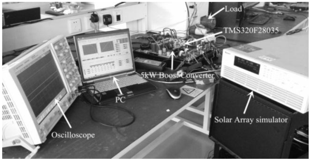To verify the effectiveness of the proposed algorithm, an experimental prototype is established as shown in Figure 13. A programmable DC power supply (Solar Array Simulator Chroma 6200H) (Chroma, Shenzhen, China) is used to simulate the output characteristics of PV arrays and a 5 kW boost converter is implemented as the power interface between the PV array and the load. At present, 5 kW is widely used in the actual photovoltaic system, and using 5 kW PV system to verify the proposed algorithm has very good practical significance. The MPPT algorithm is realized in CCS (Code Composer Studio) IDE (integrated development environment) (TEXAS INSTRUMENTS, Shenzhen, China), is then downloaded onto a digital signal controller TMS320F28035 (TEXAS INSTRUMENTS, Shenzhen, China). Parameters of the PV array and boost converter are illustrated in Table 1.