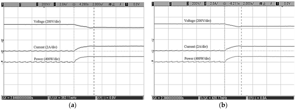 Dynamic tracking experiments are also conducted to compare the tracking performance of MPPT methods. The rise-up situation can be simulated by increasing the output power of the solar array simulator, and the output waveforms of PV array are presented in Figure 15. Figure 15a shows the results of the traditional variable step size INC, and it takes 3.92 s to reach the MPP. As can be seen from Figure 15b,c, tracking time of the proposed method with equal initial step sizes and different initial step sizes is 0.79 and 0.7 s, respectively. It is obvious that the proposed method obtains a faster response than the traditional variable step size INC method when irradiation rises suddenly.