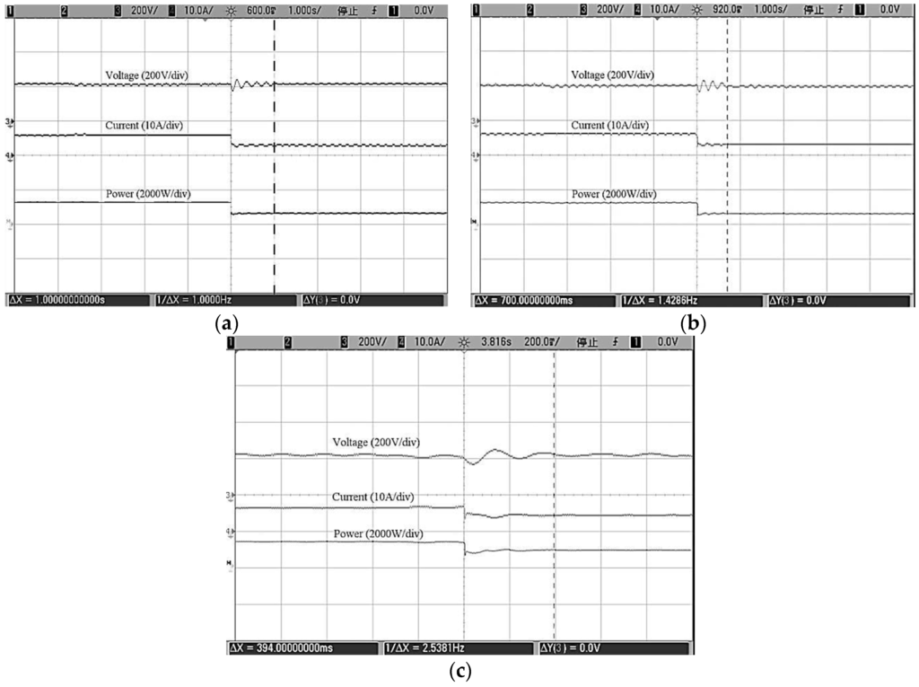 In the same way, the decreasing situation can be simulated by decreasing the output power of the solar array simulator. Traditional variable step size tracks the MPP within 1.0 s in Figure 16a. Figure 16b shows the results of the proposed MPPT method with equal initial step sizes, and the tracking time is 0.3 s faster than the traditional variable step size INC. Meanwhile, it takes 0.394 s for the proposed MPPT method with different initial step sizes to reach the MPP in Figure 16c, thus further improving the tracking speed.