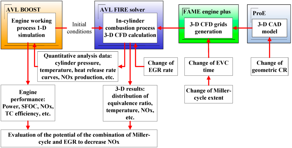 The authors used a 1-D simulation tool, AVL BOOST v5.0, to calculate the engine working process. 1-D simulation functions to output the initial conditions for 3-D CFD calculation and calculate the engine performance. Since the 1-D simulation model uses a zero-dimensional or quasi-dimensional combustion model to calculate the in-cylinder working process, it cannot fully reflect the complexity of diesel mixing-controlled combustion. The authors used a 3-D CFD code, AVL FIRE v2008, to calculate the fuel injection, fuel-air mixing, combustion and emissions formation processes. FIRE calculates in-cylinder processes and output quantitative analysis data of combustion and emission formation, which include cylinder pressure, heat release rate, mean temperature curves, and the production of NOx emissions, to BOOST for engine performance calculation. Meanwhile, for each calculation case, 3-D results of the distribution of fuel-air equivalence ratio, temperature, NOx were output and read by authors for the evaluation of in fuel-air mixing, combustion and NOx formation processes. Figure 1 shows the workflow of the investigation.