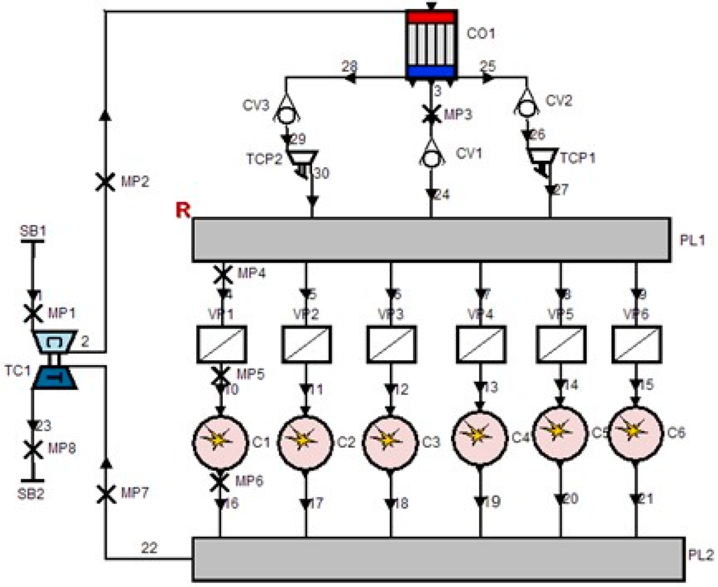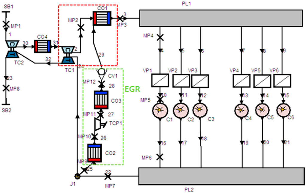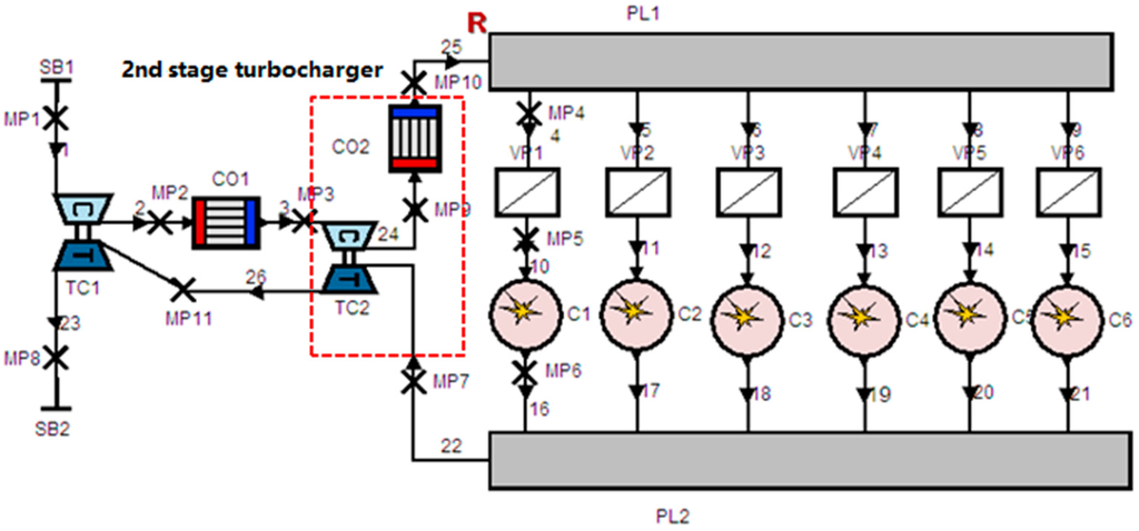 It has one more intercooler (shown as CO2) compared to the 1-stage turbocharging to further decrease intake temperature, which is an advantage to increase volumetric efficiency and reduce the combustion temperature. In order to compare the 1-stage and 2-stage turbocharging under the same conditions, for each Miller-cycle cases, the intake pressure values are the set to the same.