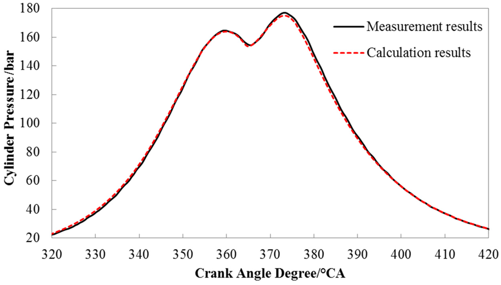 The measurement results and 3-D CFD calculation results of the baseline engine were compared. Figure 4 shows the comparison of cylinder pressure curves of the engine under full load operating conditions.