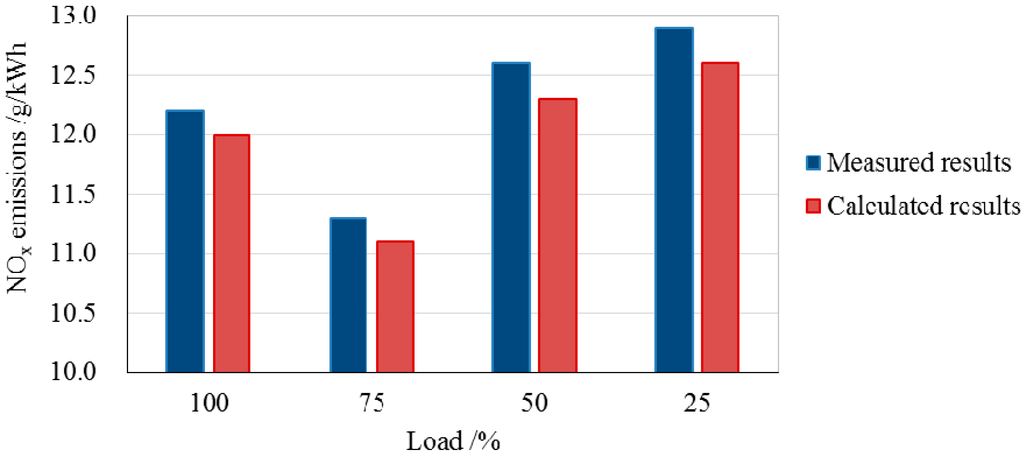 As can be seen in the figure, the calculated data agree well with the experimental data. Meanwhile, the NOx emissions calculation was validated base on the NOx emissions data measured on test bench. Table 3 lists the parameters of the NOx analyzer used in the measurement and Figure 5 presents the comparison of measured and calculated NOx results under Test cycle type E3. The deviations of calculated results from measured results are smaller than 2.4%. Based on the validation, other cases were calculated.