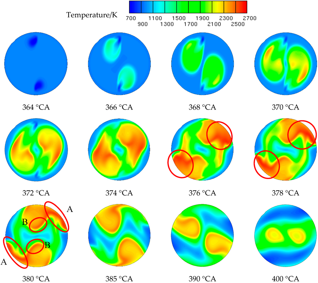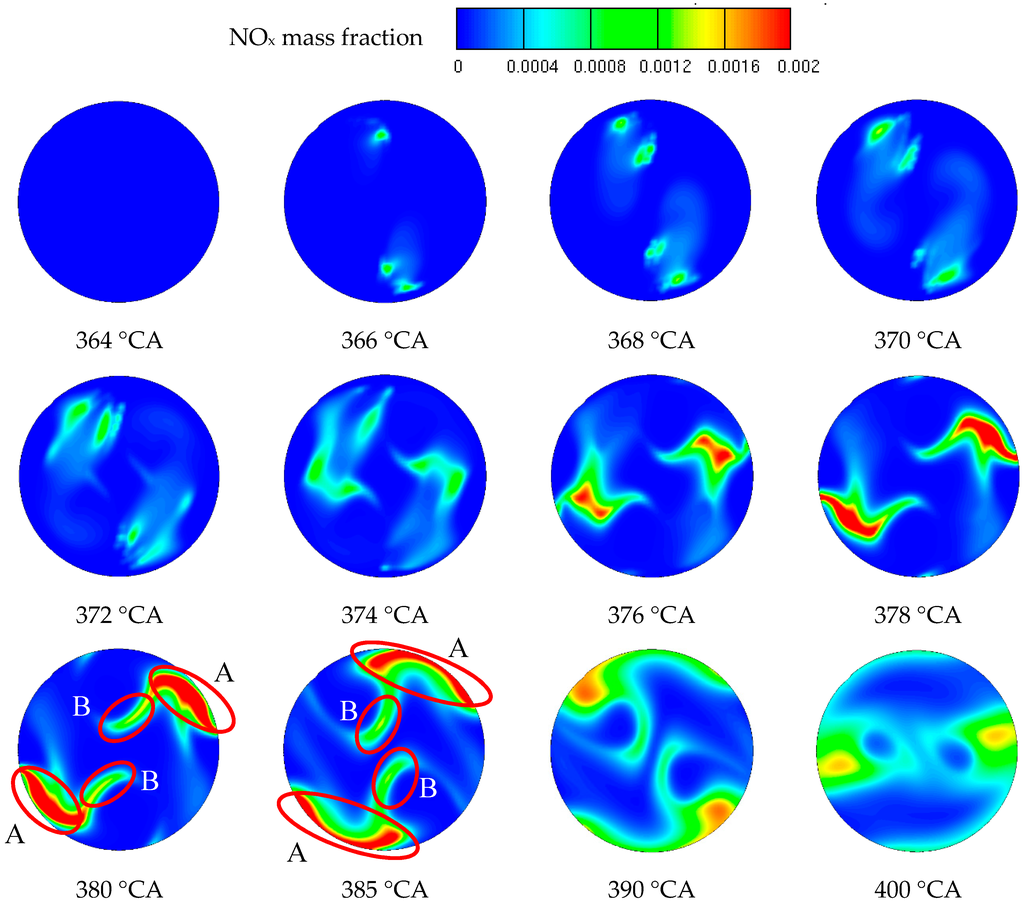 Figure 6 shows the simulation results of fuel spray injected from two injectors. Figure 7 presents the temperature distribution in cylinder during the combustion process. Figure 8 is the NOx formation in cylinder. Figure 7 and Figure 8 indicate that during the main combustion period, from 366 °CA to 380 °CA, the formation of NOx clearly correlates with high temperature distribution. Since 366 °CA, NOx can be observed in local high temperature regions. At the initial stage, peak temperatures are under 2400 K, and correspondingly NOx concentration is still low. At 376 °CA, peak temperatures approach 2617 K, and high concentrations of NOx appear in high temperature regions. After 380 °CA, with piston moving down, burned gas temperatures decrease as the cylinder gases expand. The decreasing temperature due to expansion and mixing of high-temperature gas with air or cooler burned gas freezes the NO chemistry [19]. Around the end of combustion, NOx production rate decreases [20]. Most of NOx were formed during the main combustion period. This trend agrees with the results of reference [20]. At 380 °CA, in Figure 7, there are two peak temperature region groups: groups A and B. Correspondingly, in Figure 8, there are also two NOx concentration region groups. NOx concentration region group A was formed during main combustion period, while group B is newly formed in peak temperature region group B. After 380 °CA, newly formed NOx represents only a small part of the total NOx; the highest NOx concentration regions (group A) do not correlate with peak temperature, but vary with the swirl in cylinder.