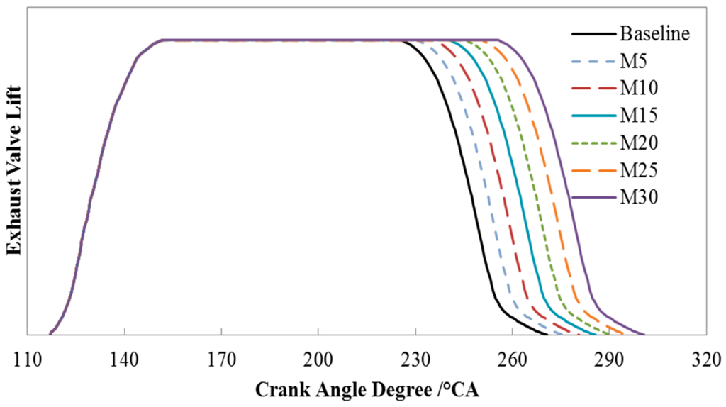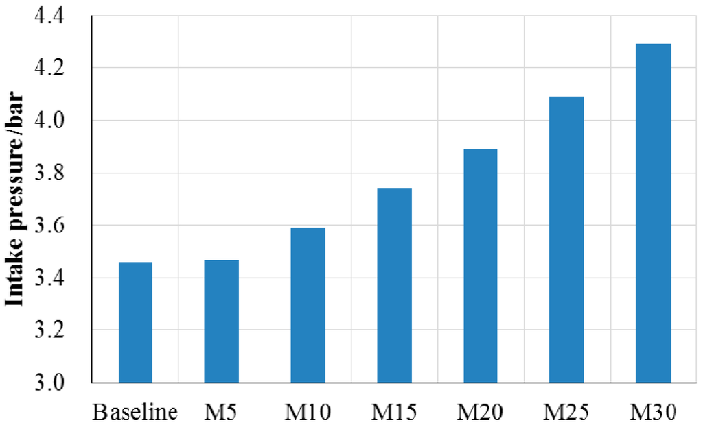 The mechanism of Miller-cycle NOx reduction in a 2-stroke engine is to retard the EVC time. The authors designed six Miller timing schemes, which take 5 °CA as retarding interval. Figure 9 shows the exhaust valve lift curves of the six schemes. In the figure, the numbers correlate with the EVC delay compared to the baseline scheme. Due to the EVC delay, a part of the fresh charge is expelled out of the cylinder. Thus, for the purpose of maintaining a similar excess air ratio, Miller-cycle schemes need higher intake pressure than the baseline scenario. With the extended Miller-timing, the intake pressure must be further increased to compensate the loss of intake charge. Figure 10 shows the intake pressure values of different schemes. The case of M30 has the highest intake pressure, being 24% higher than that of the baseline case.