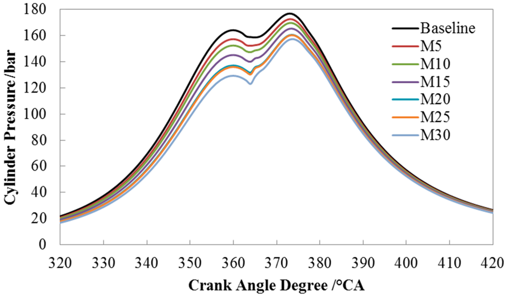 The baseline engine was equipped with a 1-stage turbocharger. Therefore, the characteristics of a Miller-cycle with 1-stage turbocharging were investigated first. The authors used FIRE to calculate the in-cylinder processes, and coupled the calculation results with BOOST to calculate the engine performance. Figure 11 shows the comparison of pressure curves of different Miller-cycle cases. It can be seen that with the increase of Miller-timing, the maximum cylinder pressure decreases due to the smaller effective CR.