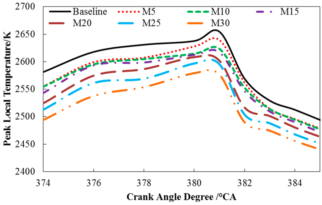 Figure 12 presents the comparison of peak local temperatures of different Miller-cycle cases. It is shown that with the increase of Miller-timing, the peak local temperature decreases. M30 and M25 have the two lowest peak local temperatures. Since the formation of NOx largely depends on the peak local temperature, 3-D results give a clear explanation of the NOx variation trend.