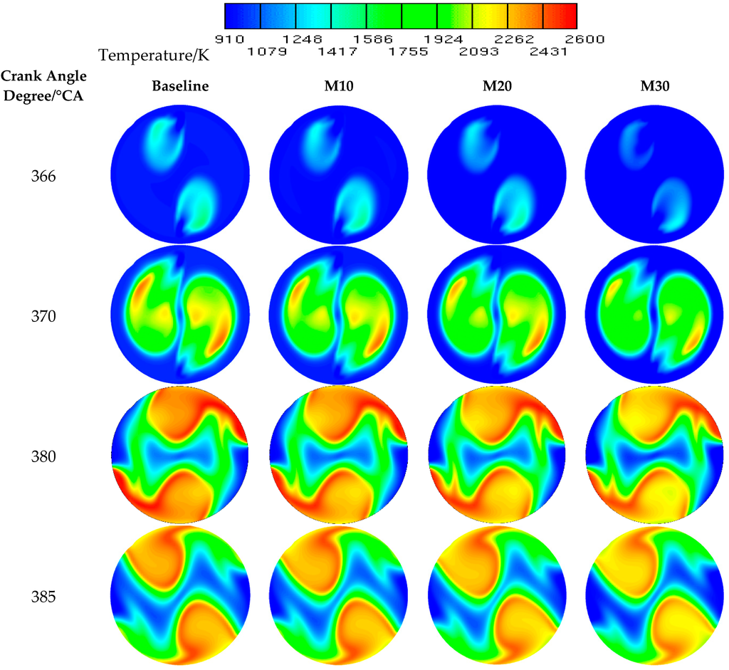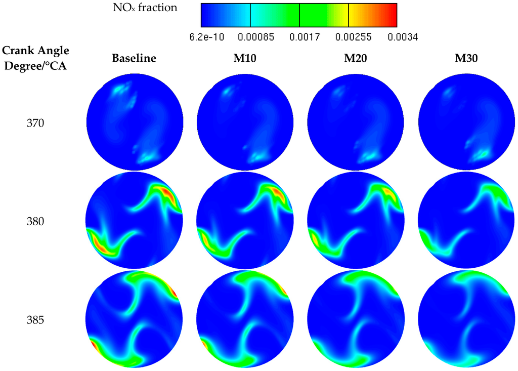 Figure 13 presents temperature distribution in cylinder by a vertical cut view, in which the temperature value is read by color. In the picture, the baseline case has the highest local temperature, and M30 has the lowest local temperature. This explains why larger Miller-timing cases have lower NOx. Figure 14 shows that Miller cases have smaller NOx mass fractions in cylinder compared with the baseline.