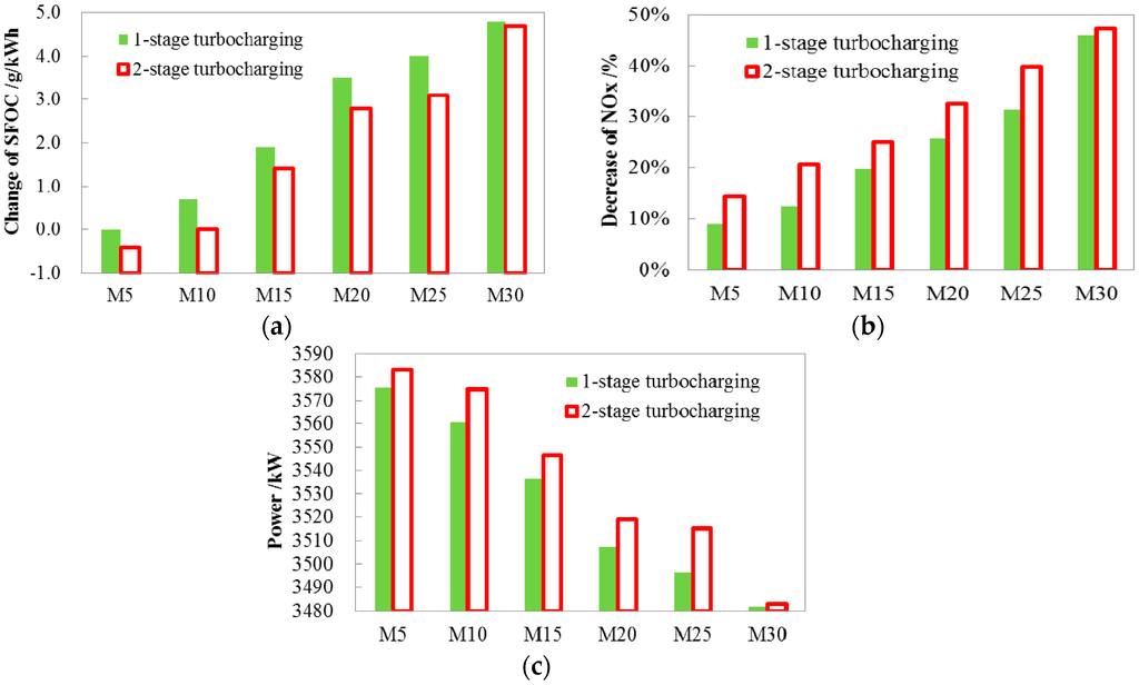 Comparison of (a) the change of Specific Fuel Oil Consumption (SFOC); (b) specific NOx emissions and (c) engine power between 1-stage and 2-stage turbocharging.