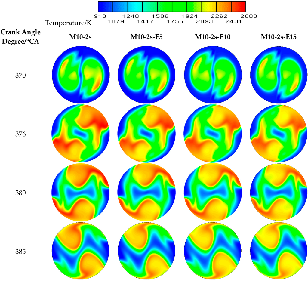 Comparison of temperature distribution in cylinder for Exhaust Gas Recirculation (EGR) cases. Note: 2-s means 2-stage turbocharging; E5, E10 and E15 mean EGR rates are 5%, 10% and 15% respectively.