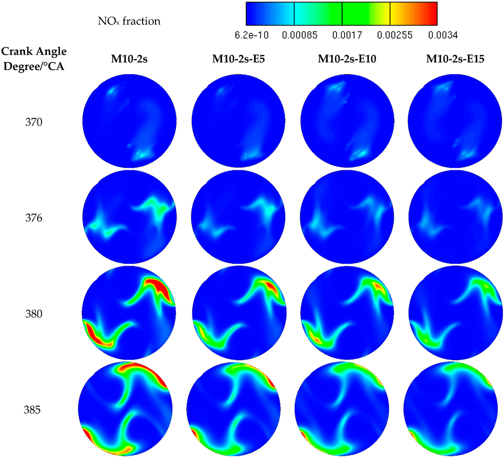 By applying EGR, the combustion temperature is reduced. Figure 18 present the 3-D simulation results of the engine with different EGR rate. It indicates that with the increase of EGR rate, the peak local temperature decreases. The peak local temperature of the M10-2s-E15 case is 2489 K, being 126 K lower than that of M10-2s case. Meanwhile, the EGR decelerate the combustion rate of the engine. Therefore, the case with EGR present apparent NOx reduction effect. This trend is shown in Figure 19.