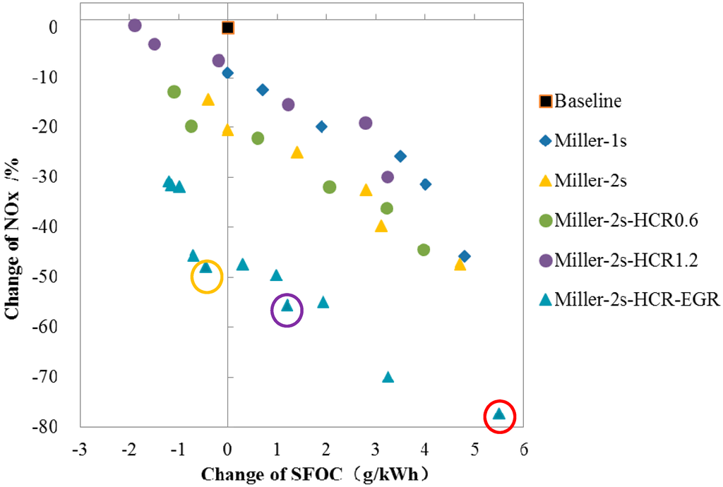 It is shown that the M10-2s-HCR1.2-E20 case (with the combination of Miller-cycle, 2-stage turbocharging, 1.2 higher compression ratio and EGR ratio of 20%, marked by a red circle) can meet IMO Tier 3 NOx standard, but with the penalty of 5.5 g/kWh higher SFOC than the baseline. The M10-2s-HCR0.6-E10 case (marked by a purple circle) has a NOx reduction potential of 55.6% and 1.2 g/kWh higher SFOC. The M15-2s-CR1.2-E10 case (marked by a yellow circle) has a NOx reduction potential of 47.9% and 0.45 g/kWh lower SFOC. The latter two cases are attractive candidates to combine other techniques to approach the IMO Tier 3 NOx standard.