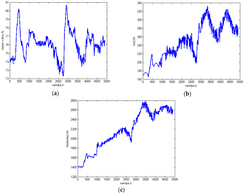 (a) Data of steam valve degree of opening; (b) Data of fuel; (c) Data of the feed-water flow.