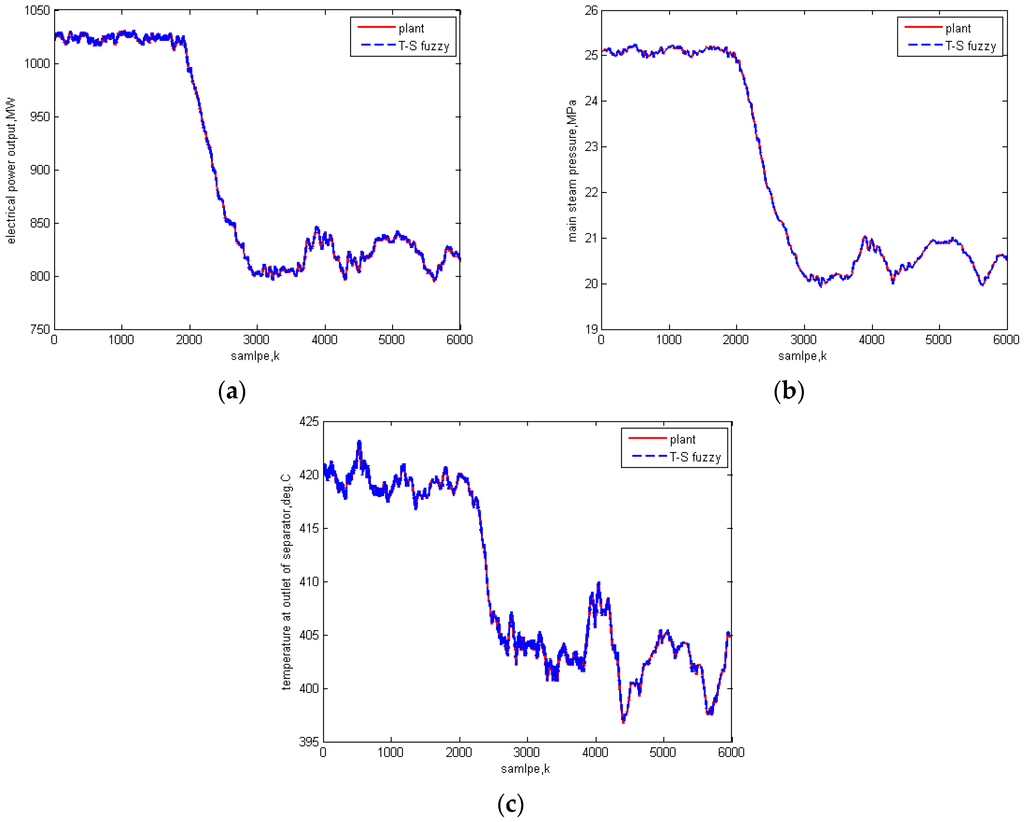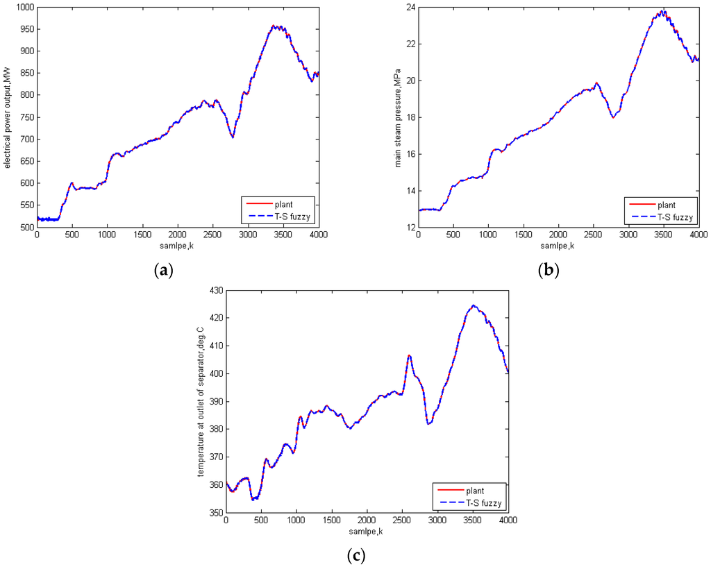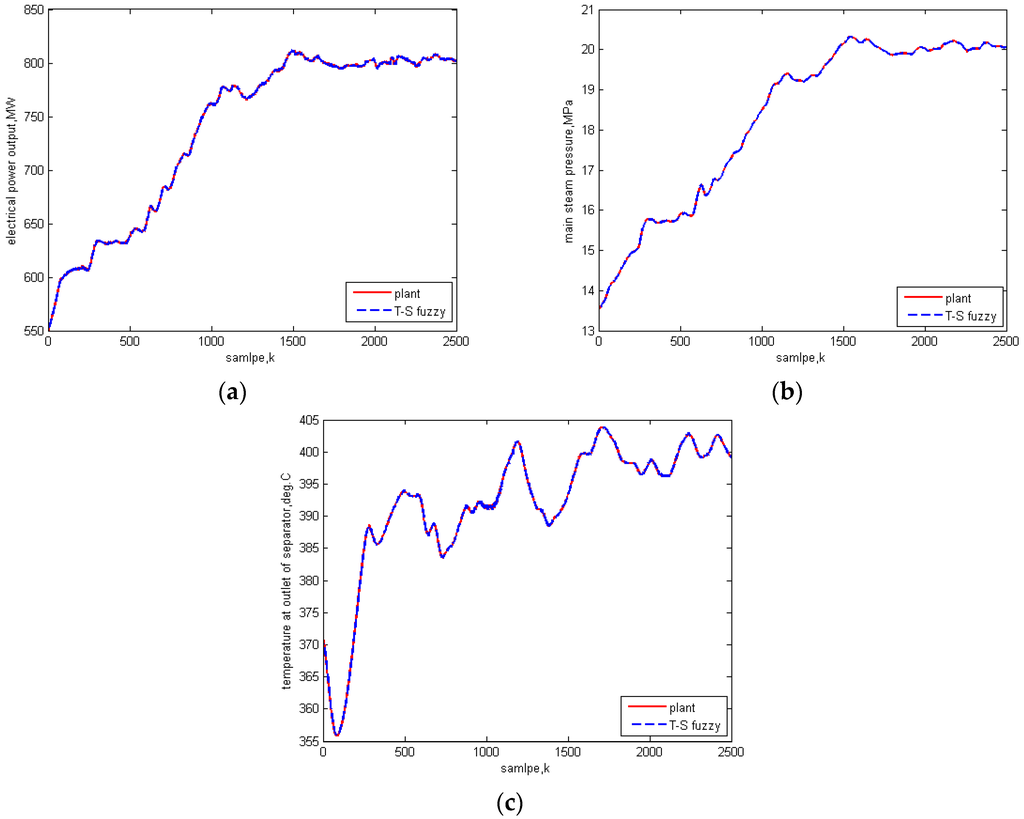 (a) Comparison of the T-S fuzzy model and training data for electrical power output; (b) Comparison of the T-S fuzzy model and training data for main-steam pressure; (c) Comparison of the T-S fuzzy model and training data for the separator outlet steam temperature.