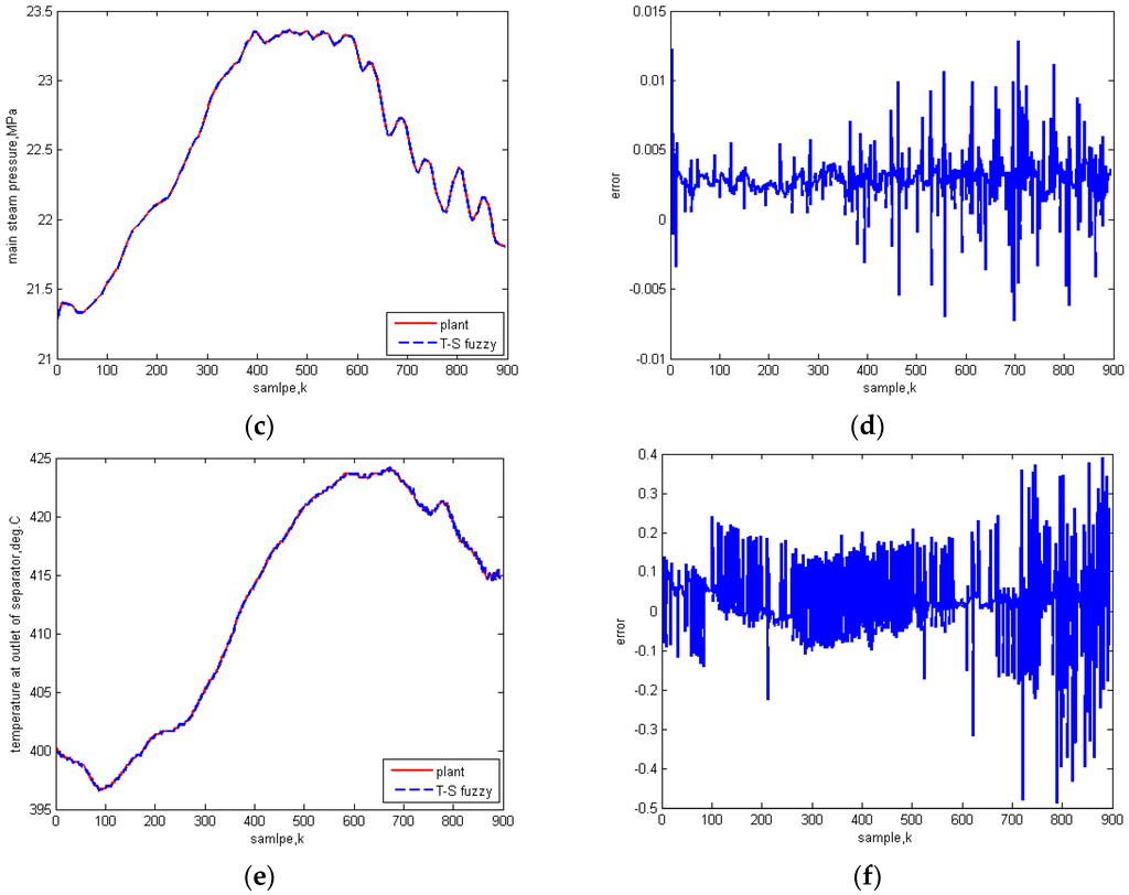 (a) Comparison of the T-S fuzzy model and test data for electrical power output; (b) validation error of the load model; (c) comparison of the T-S fuzzy model and test data for main-steam pressure; (d) validation error of main-steam pressure model; (e) comparison of the T-S fuzzy model and the test data for the separator outlet steam temperature; and (f) validation error of the separator outlet steam temperature model.