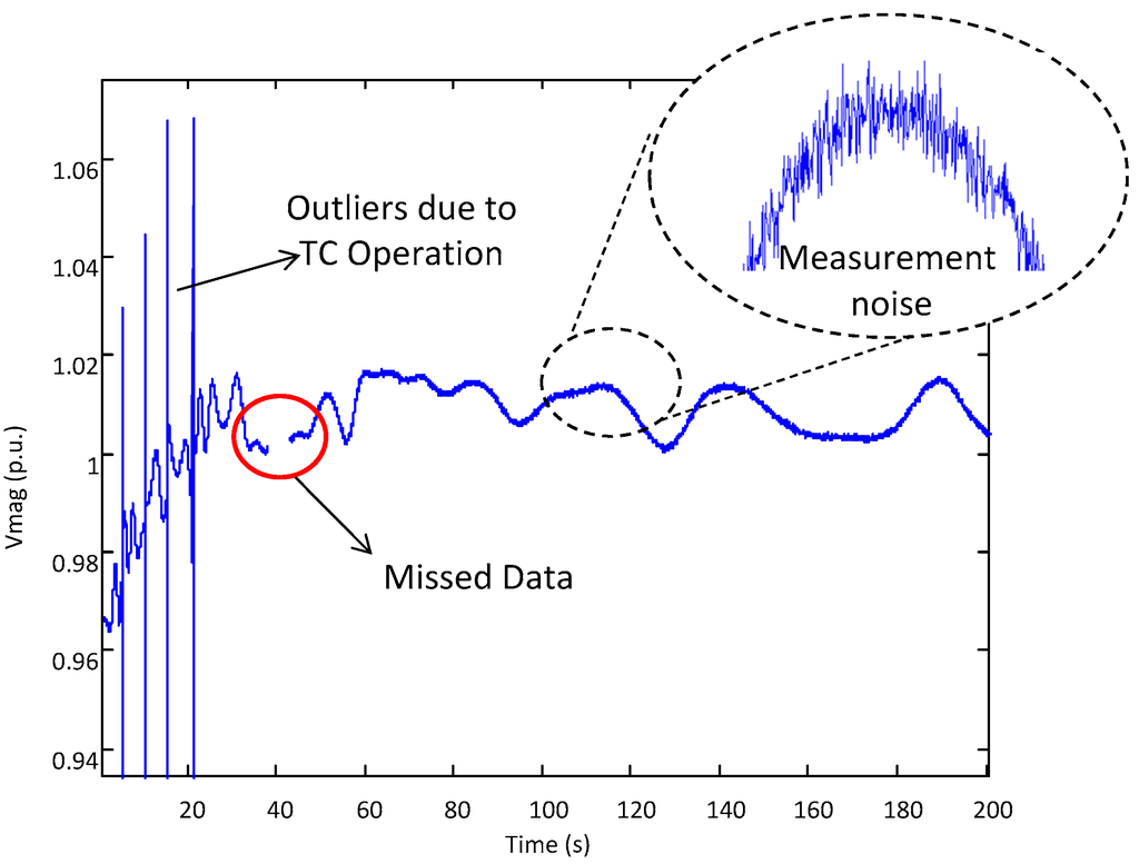 Figure 2 shows a voltage magnitude as generated by a PMU using a hardware-in-the-loop (HIL) lab setup. Discrete events, such as, tap changer operation result in outliers in PMU data, as can be seen on the left hand side of Figure 2. These outliers can affect the performance of target applications. The other problem shown in Figure 2 is missing data. Missing data is not acceptable for many applications as calculations may be affected. Also shown in Figure 2 is the problem of measurement noise. Feeding noisy data to steady state applications can lead to wrong results. Therefore, all of these practical problems need to be addressed by using appropriate data processing methods. The data processing methods using KF, adopted in this paper to overcome these issues, will be discussed in the Section 4.