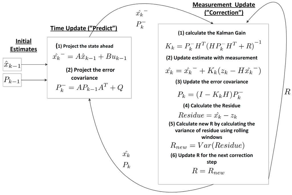 where E represents the mathematical expectation of the value. R is therefore updated in each time step, and is used in the start of next correction step: