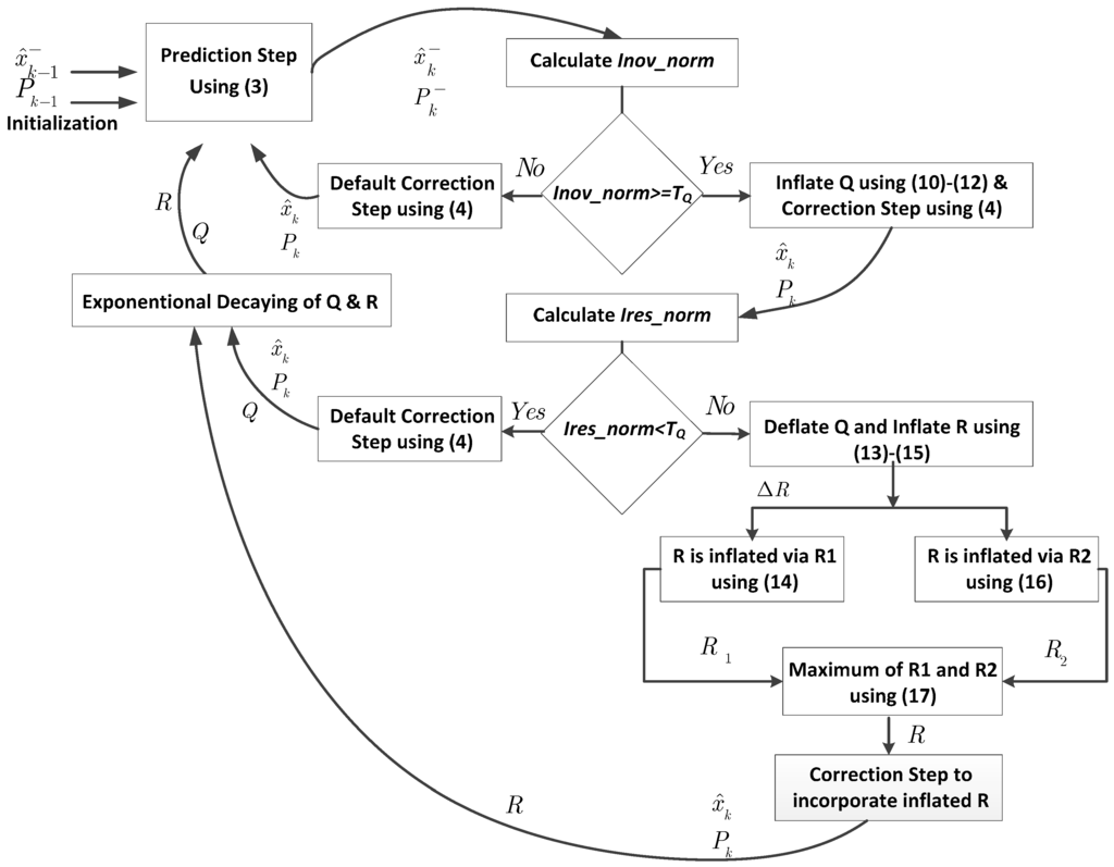 - In this step, calculate Ires-norm considering the inflated Q. If Ires-norm < tR, it means that the assumption in step 2 is correct, otherwise it indicates that the problem is caused by the bad data in the measurements. So this requires to deflate Q back to its original value and instead, inflate R such that Inov-norm and Ires-norm are reduced back to τQ (through Equations (16) and (17)) and τR (through Equations (18) and (19)), respectively. Note that as Equation (19) is a nonlinear equation, it must be solved numerically, e.g., R2 can be increased iteratively starting from R until R2(cte+R2)–1 ≥ T2. Finally note that, as shown in Equation (20), the inflated R is equal to the maximum of R1 and R2.