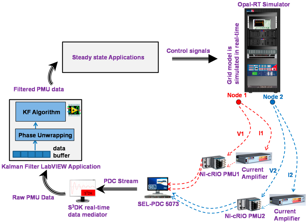 As indicated in the figure, the PMUs used in this setup are Compact Reconfigurable IO systems (cRIO) from National Instruments Corporation [21], programmed with LabVIEW graphical programming tools to perform phasor calculations [22]. As the figure shows, the current signals are passed through the current amplifiers by Megger [23] before being fed to the PMUs. Syncrophasors are then sent to a Phasor Data Concentrator (PDC) which streams the data over TCP/IP to a workstation computer holding Statnett’s Synchrophasor Development Kit (S3DK) [24], the real-time data mediator that parses the PDC data stream and makes it available to KF application in the LabVIEW environment. The output of the KF application is stored in a reconfigurable data buffer, from which the steady state applications read the data.