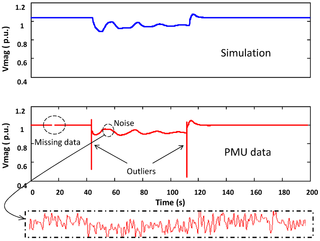 PMU application development cannot rely on offline simulation data only. There are many practical issues that can be observed from real PMUs that are not present in offline simulations. For example, Figure 6 shows a very clear illustration for this argument. A power system is disturbed with random load variations (RLV) activated at t = 45 s and deactivated at t = 115 s. The voltage response from the simulation and the HIL PMU setup is shown in Figure 6. It can be clearly seen that the voltage from the HIL PMU setup has missing data, which is due to the fact that the PMU data is delayed for a longer time than the PDC maximum waiting time. Also, with the discrete event of connection and disconnection of the RLV, the PMU generates outliers. Hence, in the development of methods in Section 4 and the illustrations below, only data from the RT HIL setup is used.