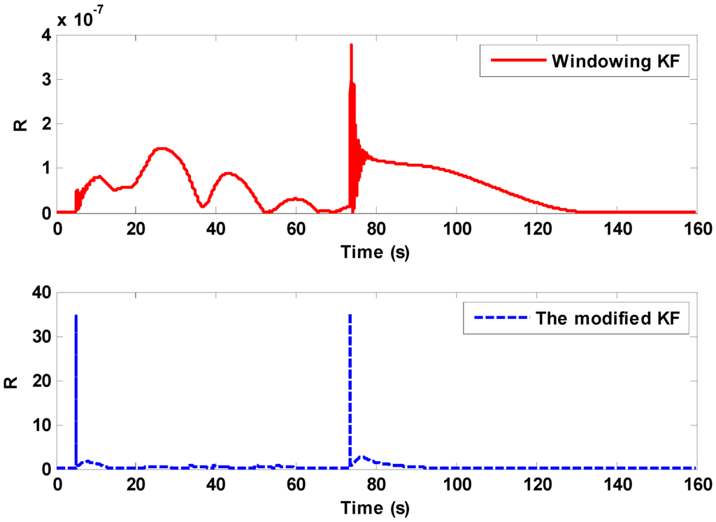 The resulting responses of R are shown in Figure 10. It is worth noticing that the responses of updating R are different in both methods based upon the fact that both methods used a different logic to update R. Although there are no outliers in voltage angle signal, R increases for both methods during the period having oscillations. For “the modified KF”, R comes back to its normal state much faster than with the windowing method.