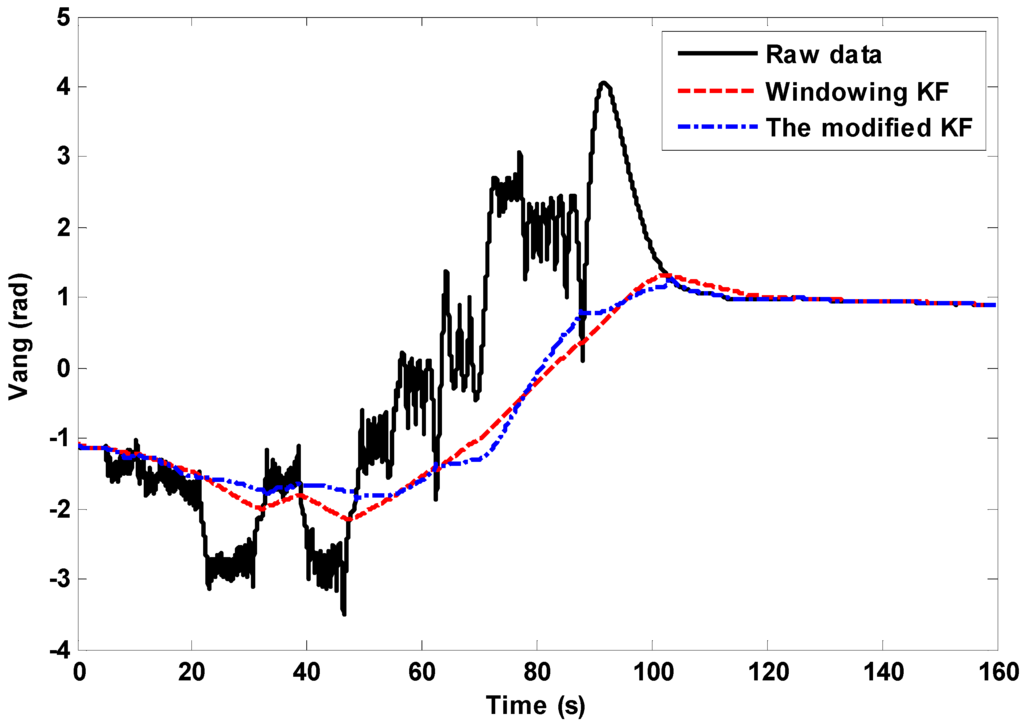 The evaluation metric A/K has the highest value for windowing method for the case RW = 5 s and lowest for the case RW = 0.5 s. This means that RW = 5 is the worst in following the steady state value and RW = 0.5 has the best performance as can be seen from Figure 11. By comparing the performance of both methods (i.e., windowing method and “the modified KF”), the response for “the modified KF” has the minimum value of evaluation metric A/K showing that it performs better than windowing method.