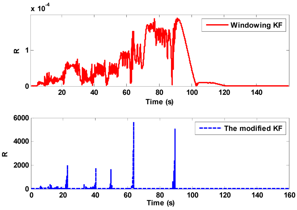 The variance of the calculated residue in Equation (5) is computed in each step in Equation (6) using rolling windows. This gives the measurement covariance matrix R: