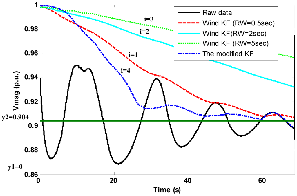 Table 1 shows the performance analysis of the KF windowing algorithm for different RW lengths and for “the modified KF”. The steady state value of the raw PMU data is assumed as the average value of the signal between the time period of t1 and t2, which comes out to be 0.904 p.u. (green line in Figure 11). The areas between the steady state value and each filtered signals are calculated as follows: