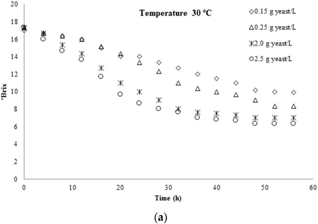 The influence of yeast on the performance of bioethanol production via fermentation was already studied. For example, Peña and Arango [20] evaluated the ethanol production, cell growth and substrate consumption of several Saccharomyces cerevisiae strains. Two sucrose concentrations (170 and 250 g/L) and two substrates (industrial with sugar cane molasses and synthetic with sucrose) were evaluated. Other studies have aimed to characterize the effect of some operational parameters such as pH, temperature on the fermentation efficiency of Saccharomyces cerevisiae [21,22]. Based on these studies, this paper proposes a mathematical model for the evaluation of the dissolved sugars content (measured as °Brix) to estimate the amount of alcohol produced (volume of distilled alcohol) and its quality (alcoholic strength). This was supported by experimental data from fermentation of cane juice from the Facundo Vela sector, Ecuador, under different conditions of temperature and concentration of Saccharomyces cerevisiae.