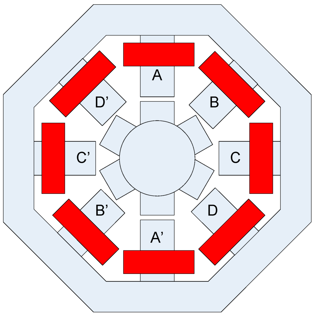 Figure 1 shows the structure of an 8/6 four-phase switched reluctance motor, which is the same as the generator that will work in self-excited mode and with alternating current. Two opposite coils, A and A’, are series-connected to form a phase a. The same applies to phases b, c, and d.