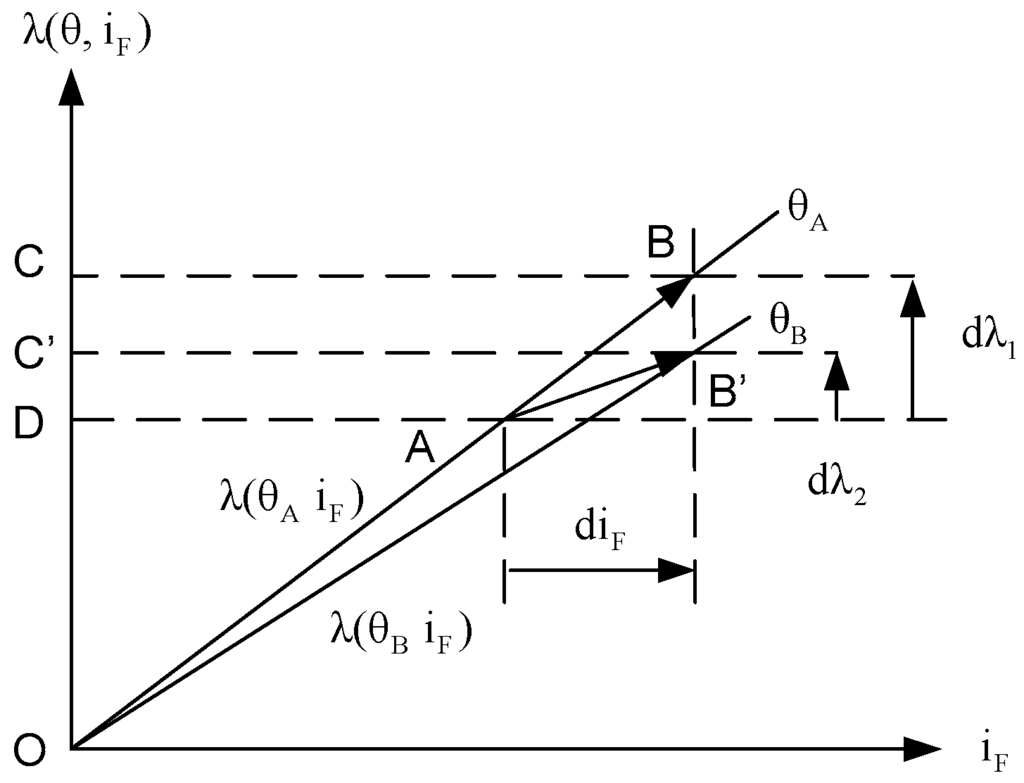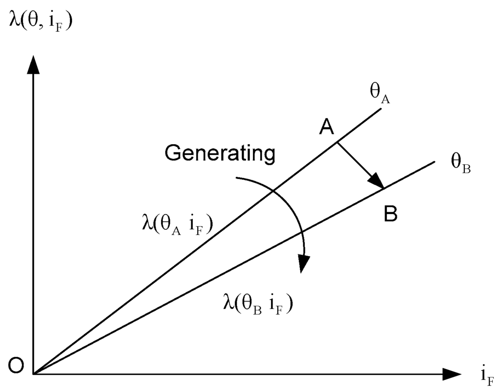 Path A-B occurs without machine movement and there is no transformation of mechanical energy. Area DABC is the electrical energy supplied to the machine that is stored as magnetic energy. Path A-B’ meets the conditions of Equation (3). Area OAB’ is the mechanical energy absorbed by the machine. Area DAB’C’ is the electrical energy supplied to the machine. Both are stored in the machine as magnetic energy.