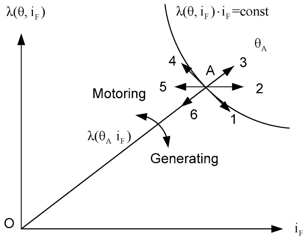 Figure 6 shows these paths. Along paths 3 and 6, the rotor does not move and there is no mechanical energy. Along path 3 the electrical energy is stored as magnetic energy. On path 6, the opposite to path 3 occurs. Paths 5 and 2 do not involve electrical power exchange. The mechanical energy is transformed and stored as magnetic energy along path 2. On path 5, the opposite to path 2 occurs. On paths 4 and 1, there is no exchange of magnetic energy. The mechanical energy is transformed into electrical power along path 1. On path 4, the opposite to path 1 occurs.