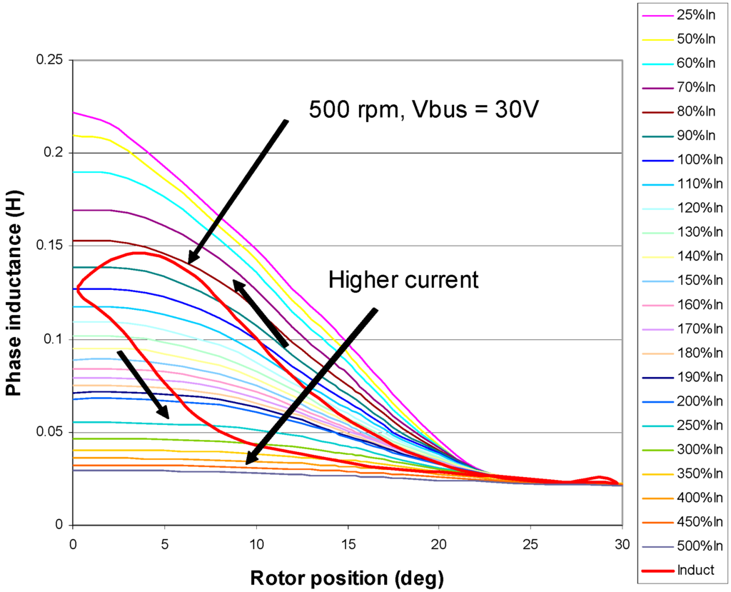 The inductance profile according to phase current and misalignment angle between the excited phase tooth and the nearest rotor tooth. The phase current is used as a parameter. The inductance for a path when the motor turns at 500 rpm and has a rectifier as load that feeds a 30 V DC bus was superimposed.