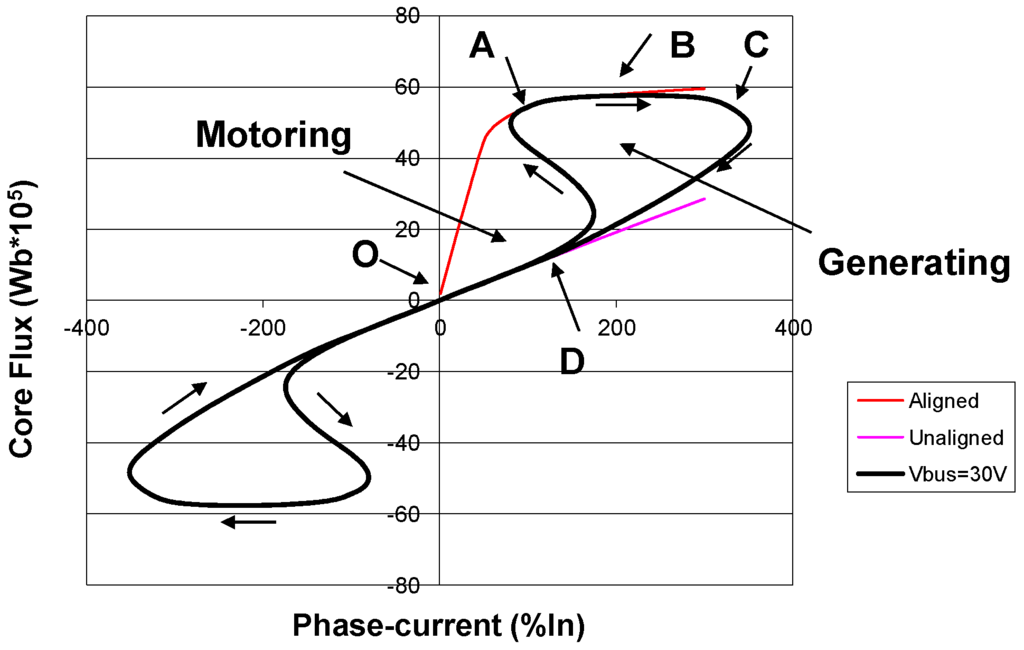 Flux-phase current path of a cycle, showing the representative points. The linked area during a cycle represents the mechanical energy transformed. The machine turns at 500 rpm and has a rectifier that feeds a 30 V DC bus as a load.