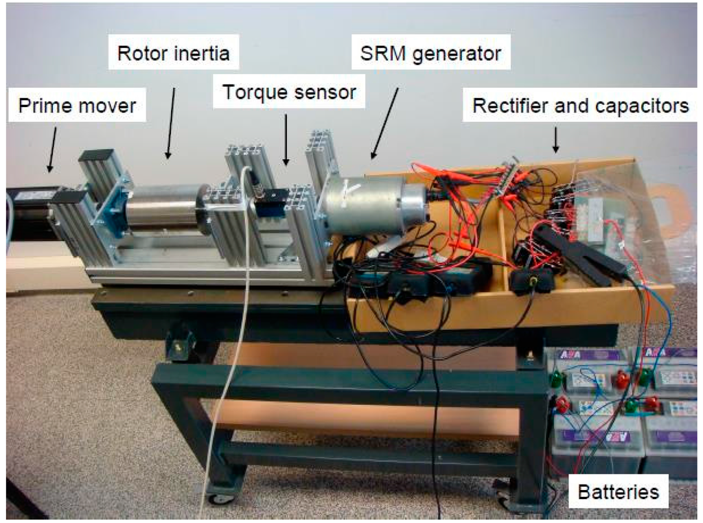 Figure 10 is used for experiments. A 495 μF capacitor is used. The battery bank is composed of five batteries of 12 V connected in series. The machine rotates at 710 rpm. The prime mover is a torque controlled synchronous motor. Rotor inertia is driven by the motor to smooth speed oscillations due to the pulsed torque. A 20 N·m torque sensor is placed between the inertia and the 8/6 switched reluctance generator [