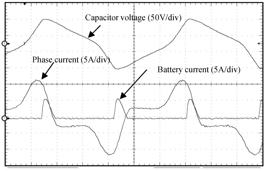 Time-related measurement of capacitor voltage, phase current and battery current. Only one phase of an 8/6 motor that turns at 710 rpm has been used. Horizontal scale of 515 ms/div (div: division).