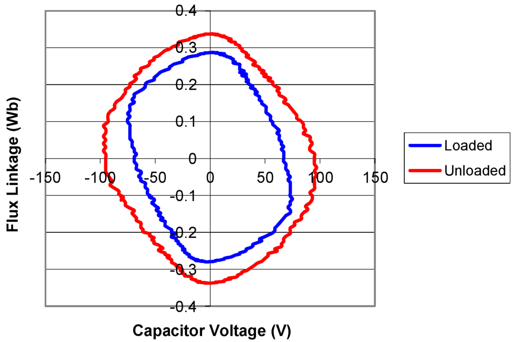 Figure 13. The increase in the linked area is due to the incorporation of energy demand when the battery bank is connected. The decrease in flux amplitude is due to the decrease in the voltage amplitude of the capacitor. The shapes of the curves have the form obtained numerically in